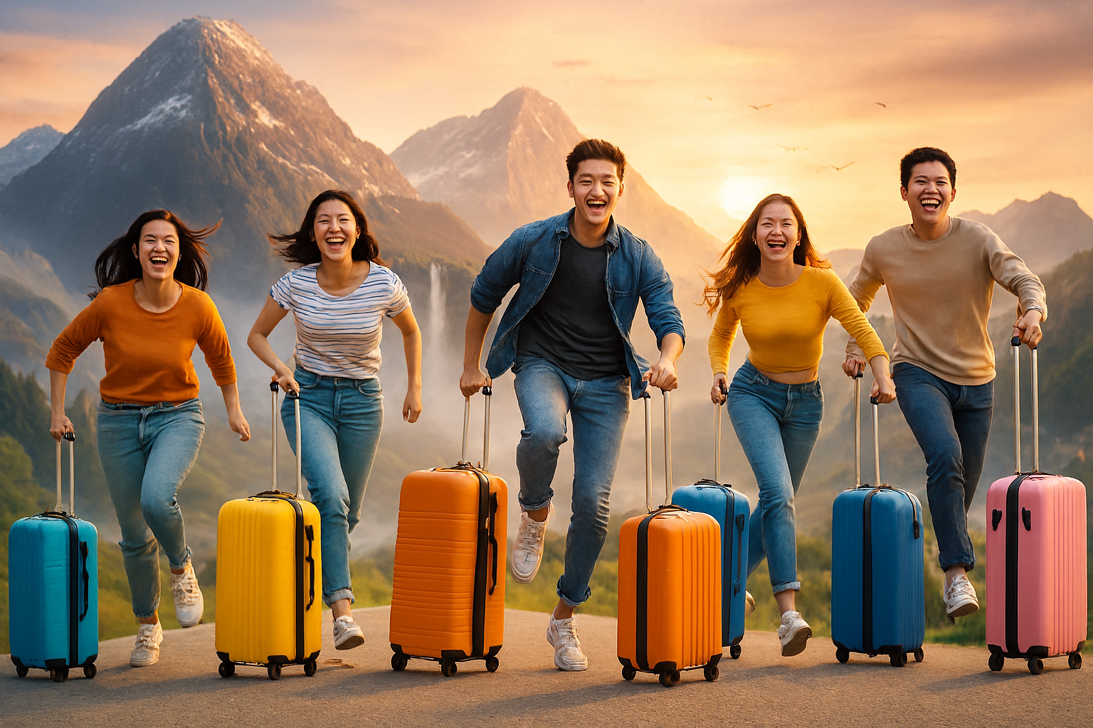 สร้างภาพ กลุ่มวัยรุ่นทั้งหญิงและชาย จำนวน 5 คน กำลังวิ่งและกระโดด ด้วยใบหน้าที่ยิ้มแย้มแจ่มใส ทุกคนกำลังลากกระเป๋าเดินทางสีสัน สดใสมุ่งหน้าออกไปเที่ยว มีภาพภูเขาสูงใหญ่ มีน้ำตก และนกบินอยู่ไกล ๆ เป็นภาพพื้นหลัง