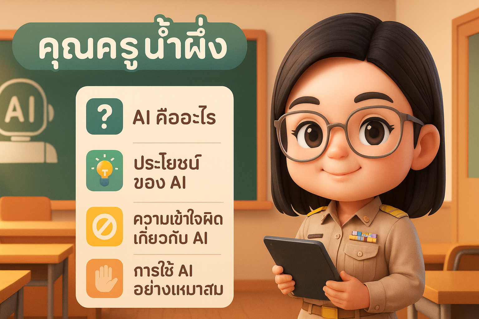 สร้างภาพอินโฟกราฟิกการ์ตูน 3D สไตล์จิบิ หัวข้อด้านบนเขียนว่า “คุณครูน้ำผึ้ง” มีตัวละครครูวิชา วิทยาการคำนวณ ใส่ชุดสูทสีดำ กระโปรงสีดำ ตามภาพที่แนบมา ตัวละครอยู่ด้านขวาของภาพ ยืนถือ IPAD ยิ้มอบอุ่น ฉากหลังเป็นห้องเรียนที่มี AI ด้านซ้ายของภาพมีกรอบข้อมูล 4 ช่อง พร้อมไอคอนและข้อความสั้น ๆ ได้แก่ 1. AI คืออะไร 2. ประโยชน์ของ AI 3. ความเข้าใจผิดเกี่ยวกับ AI 4. การใช้ AI อย่างเหมาะสม โทนสีปรับให้เหมาะสมกับวิชาที่สอน สไตล์ภาพ: การ์ตูน 3D จิบิ แสงนุ่ม องค์ประกอบสมดุล อัตราส่วนภาพ 16:9 (แนวนอน)